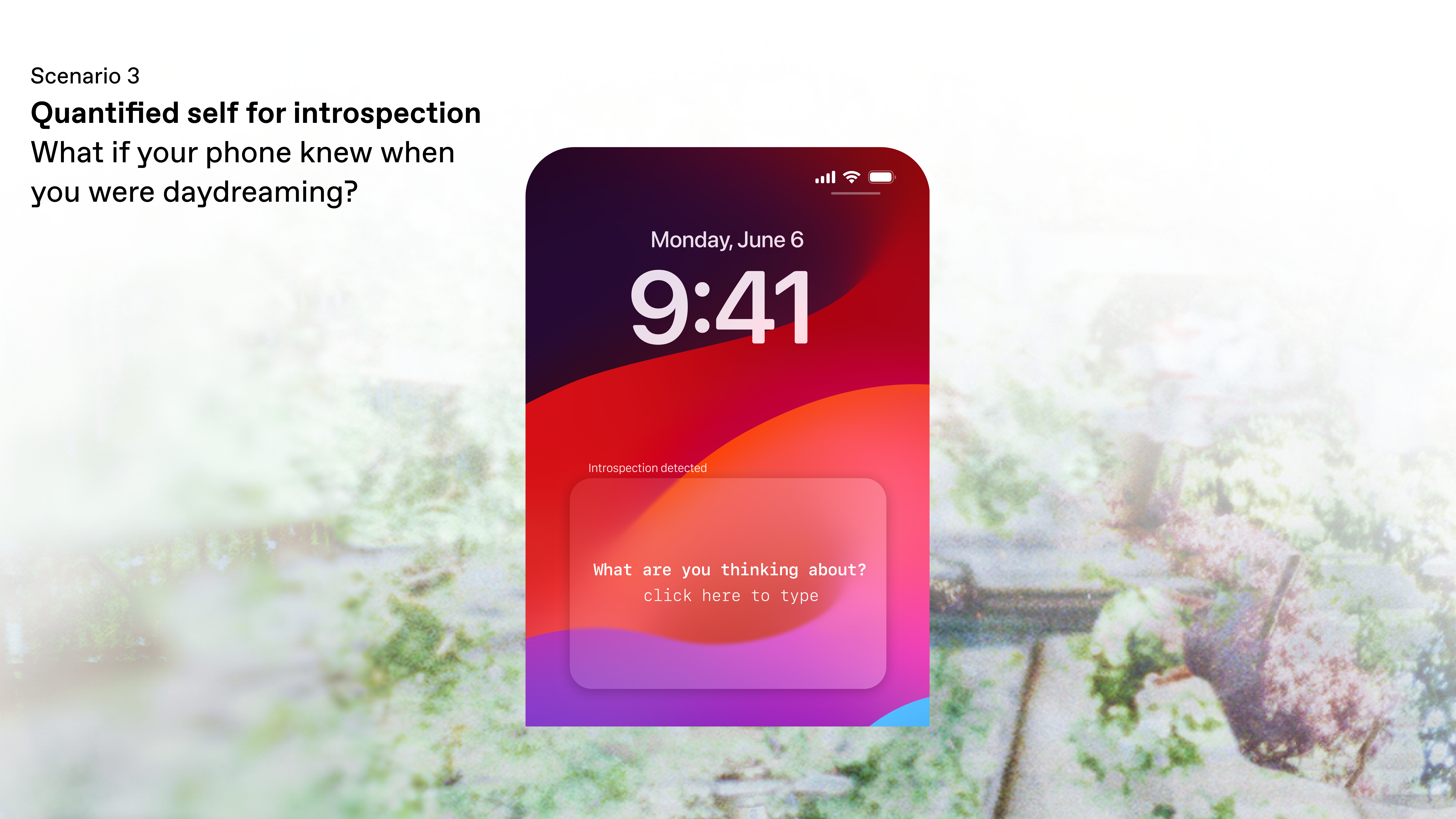 Daydreaming as paradigmDigital introspection is an explorative interaction design project looking at new ways of contextualizing screen usage, disconnecting, and preserve introspective mind-states such as mind-wandering and daydreaming, in the context of the smartphone.