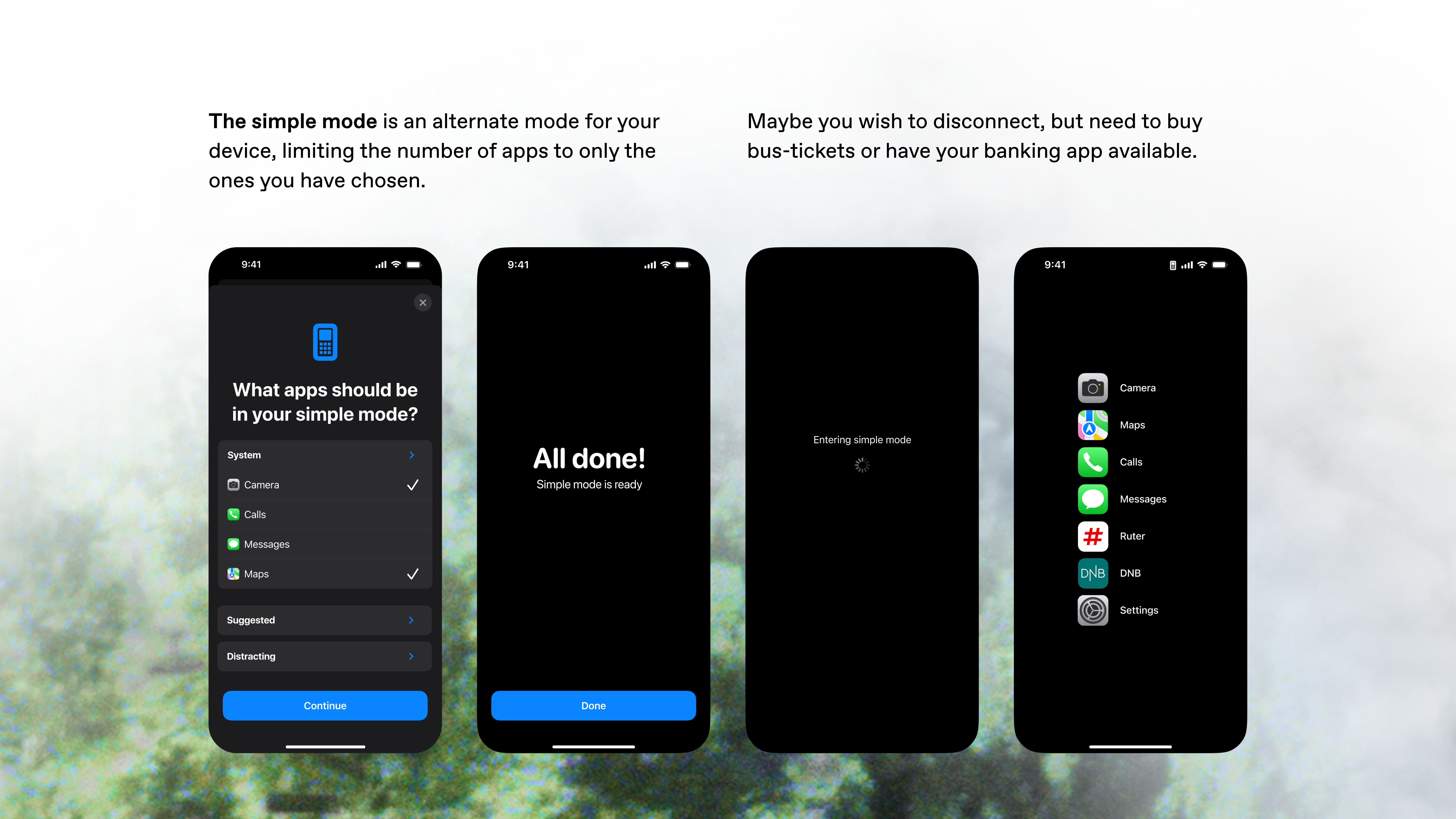 The project consists of three main scenarios, each exploring a theme relating to digital wellbeing, displaying a breadth of possibilities and new opportunities for how we define our relationship to our devices.